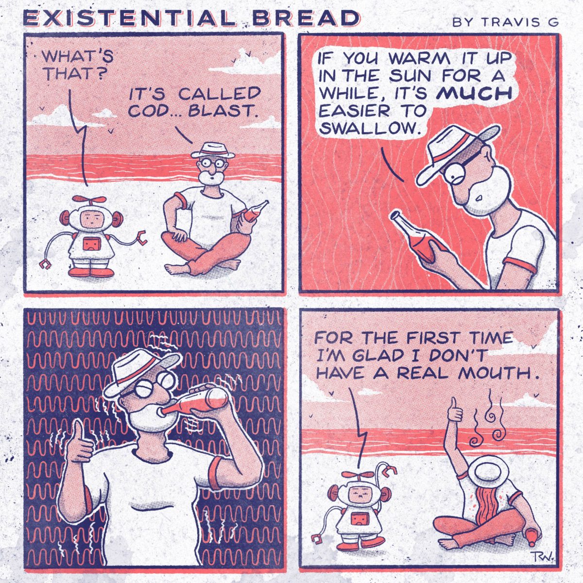 It’s a good opportunity to practice extreme poses and reactions. I’m particularly happy with the “drinking but hardly being able to bear it” in panel three.