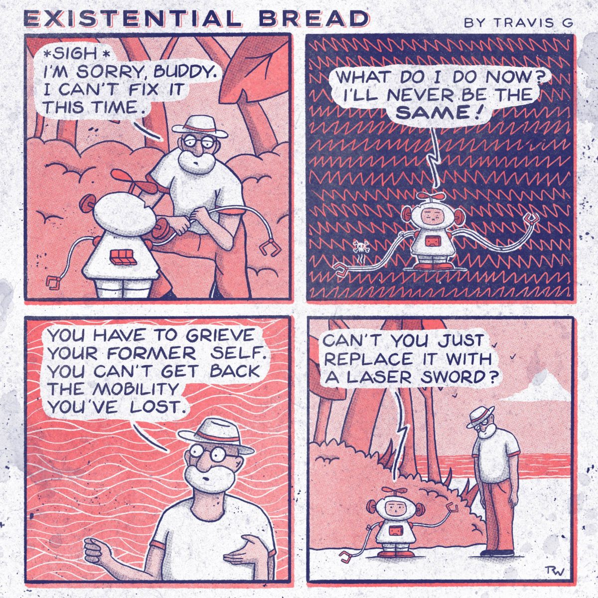 Honestly not going to lie, I’m mighty proud of this one! It captures the dynamic of the two characters—Sam is clearly a caretaker of Roy—and it has a fun little lesson in there. Features the first shot of R-0Y from the rear! You can see the anime inspiration maybe in panel two. Every panel was a bit of a challenge, and I’m not ashamed to say I used AI to generate some general poses that helped me get everything laid out and sketched nicely and efficiently.