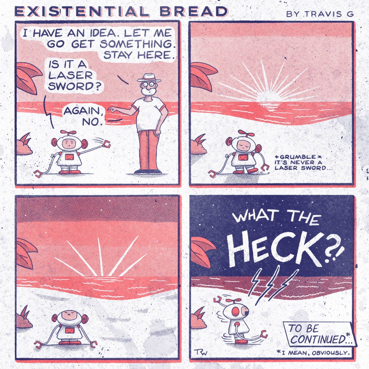 This comic achieved a bunch of objectives. It continues the story line, I get to draw some different lighting and backgrounds, and you get to see how childish and silly the R-0Y character is.