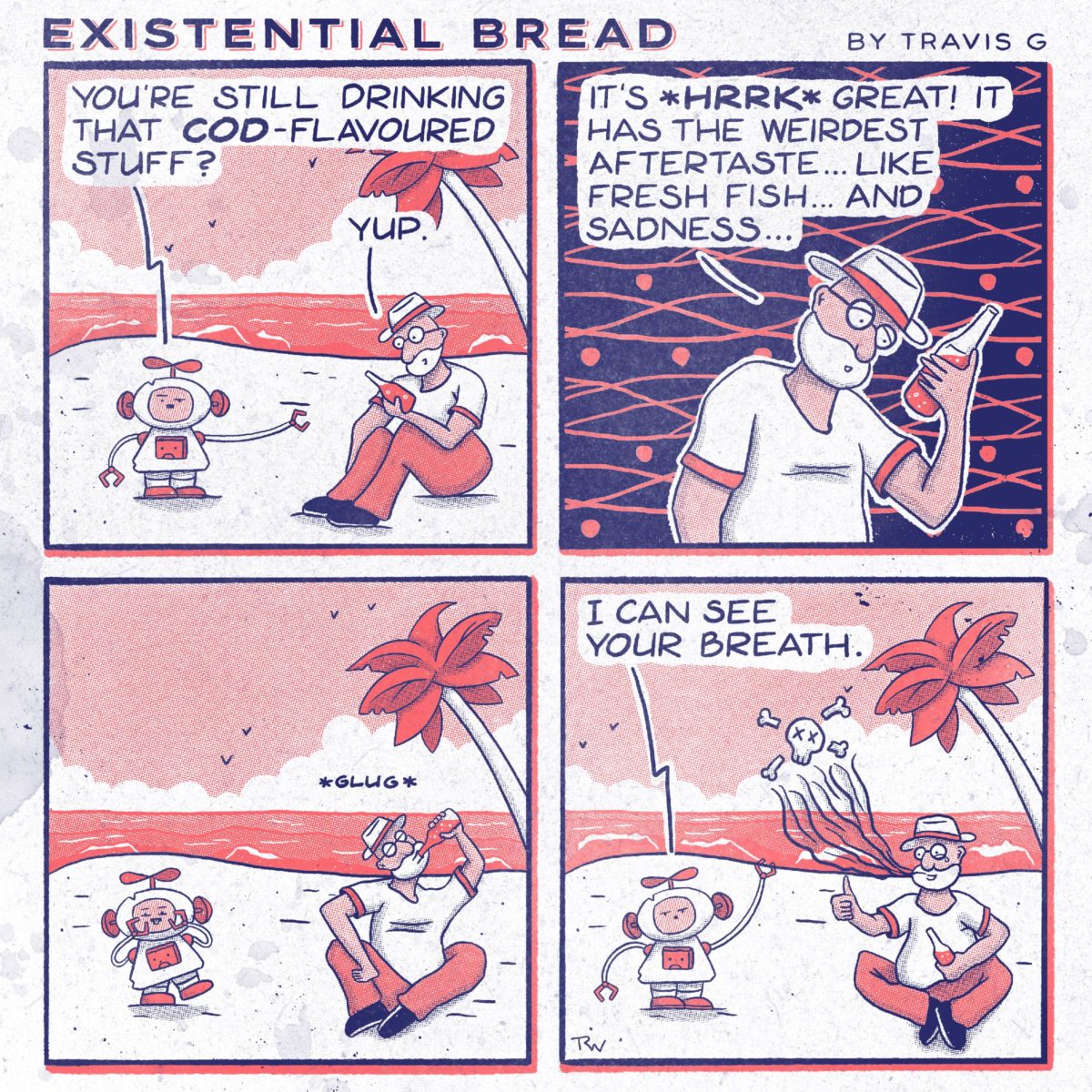 Continuing the side story of Sam’s interactions with our favourite cod-flavoured soda beverage. Still not sure how this story line will resolve, but I’m having fun just playing with the idea of such a delicious fishy drink.