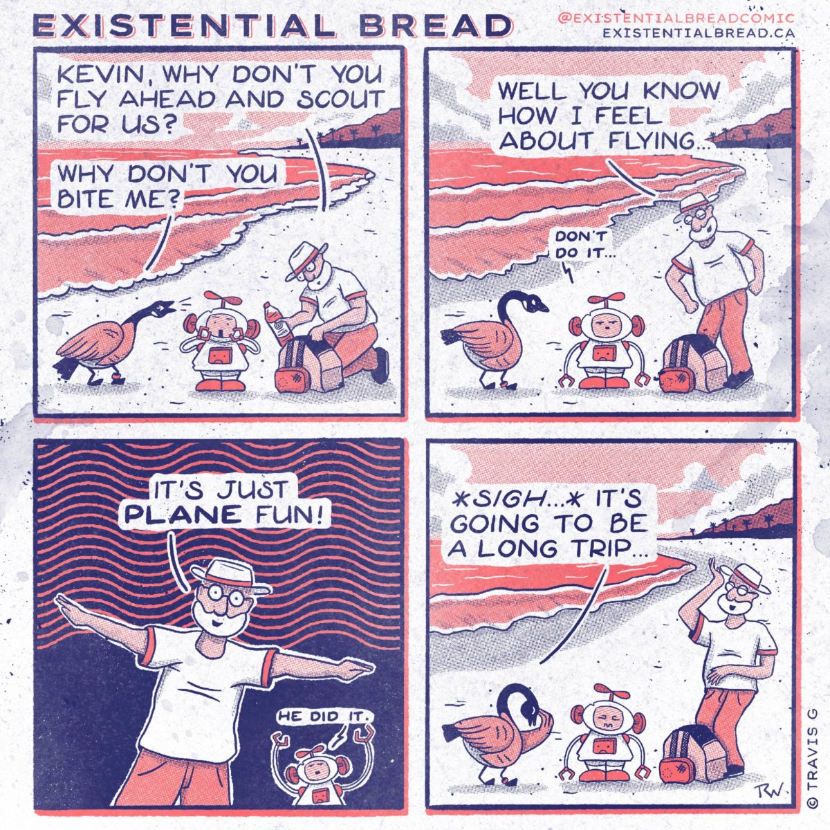 I like the multiple layers and quips going on here. It’s not just the delivery of the main pun, but I get a little characterization (Kevin is a cranky jerk, and doesn’t seem to want to fly…), and a nice reaction panel, giving more character flavour whenever possible. I think maybe it’s good world-building, plus I like the extra jokes going on, like Roy’s anticipation and reaction to what must be the zillionth pun thrown around the island.