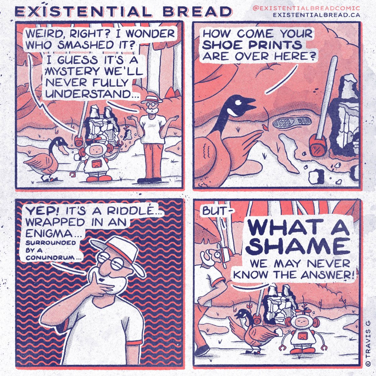 I really struggled with the writing of this comic. I wanted to give some hints as to the origin of the statue, and at one point had a partial inscription to reveal. I threw out those ideas and just went with the core idea: implicate Sam. What’s his connection to the statue? Why did he destroy it?