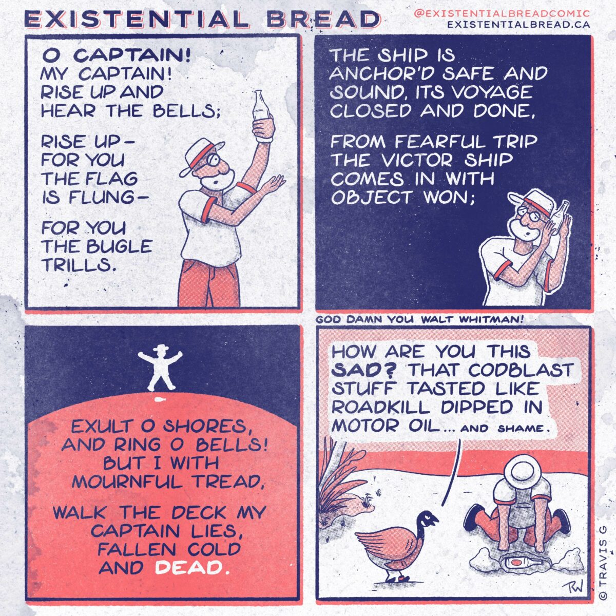 This comic only took four hours! I feel like I earned a comic with no backgrounds, and the type really needed to be the star here. I settled on ‘O Captain My Captain’ by Walk Whitman since it was public domain, not too long (I only used about 30% of it any way) and had the emotionality that I was looking for. I think the joke of “he’s sad because there’s no more gross drink” works really well in this four-panel format.