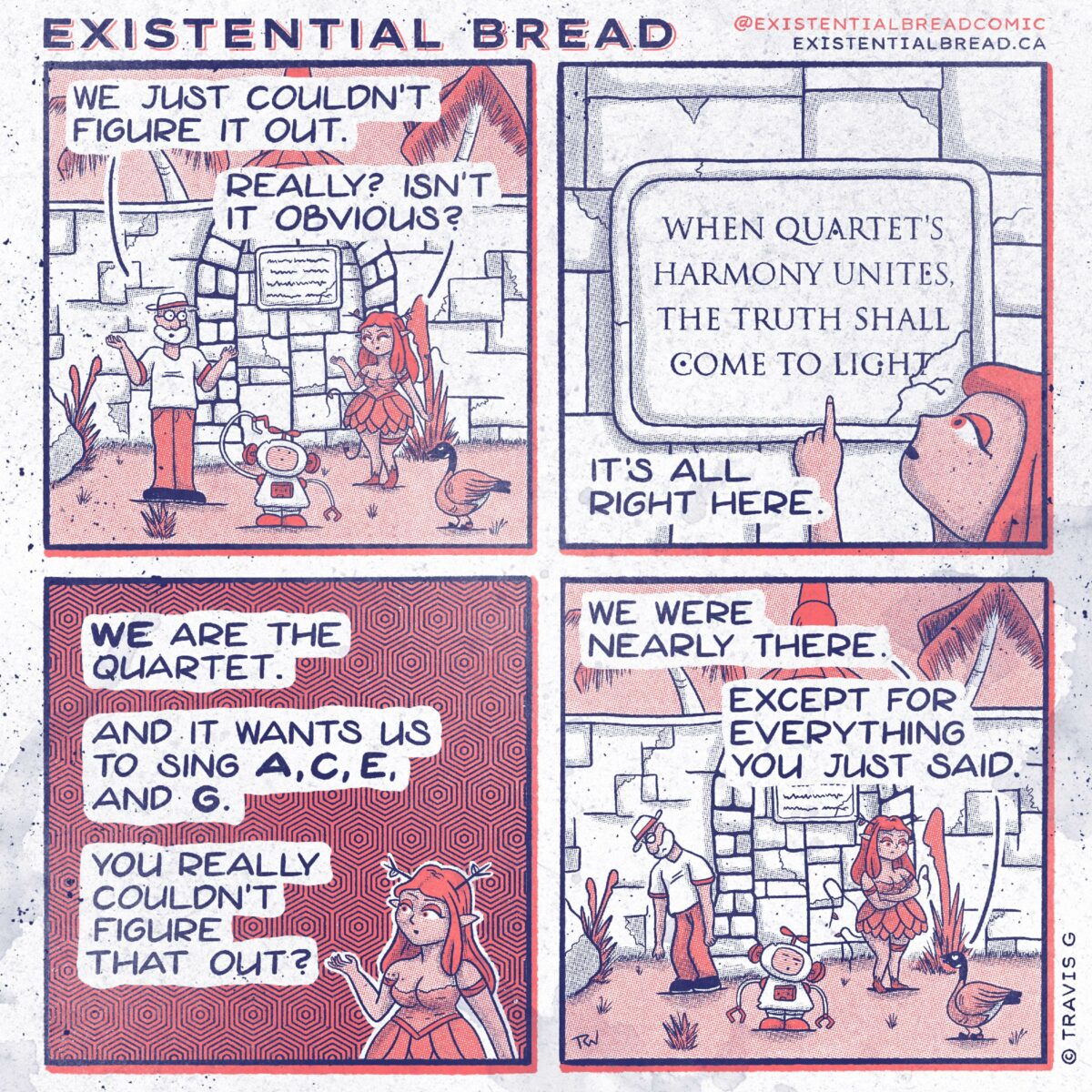 Might be my favourite comic so far? I say that tentatively because my favourite number is 83, and I like the payoff of this joke, having been set up way back in Comic #067. I actually didn’t figure out the solution to the riddle until I started this comic! I knew it would have something to do with the four singing, but I had to do some research to figure out which notes they would need to play. A-C-E-G sounds nice on the piano, and thankfully the letters appear in that order!