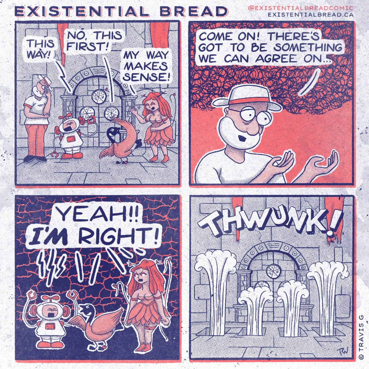 I had the final panel of this comic for MONTHS, appearing in the original drafts as “Panel 4: They all fall through the floor”. The other three panels barely came together before this week! A lot of the time I get the final panel/punchline and work backwards. I’m sure other comedy writers would agree… if I knew any.